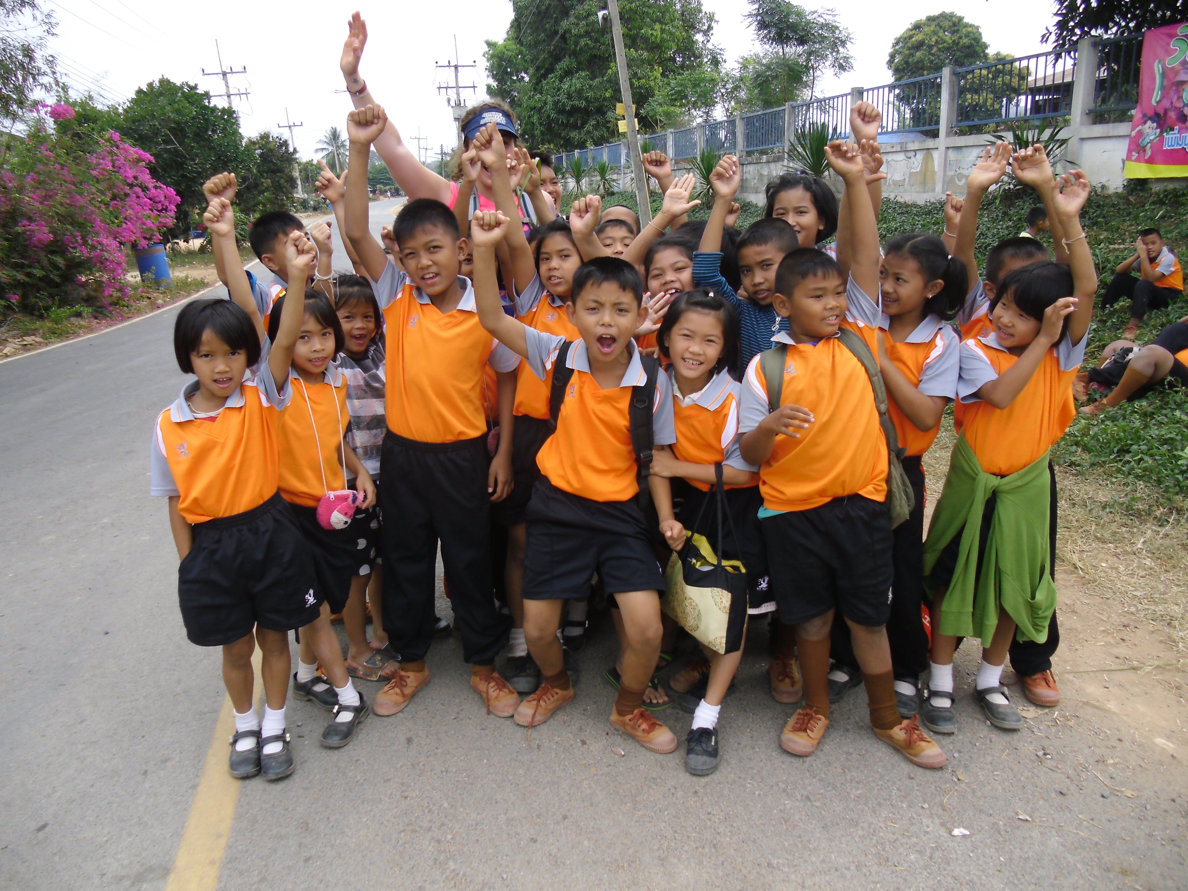 I would walk and then run and pass the Red Frenchie, and then walk and he would pass me. I truly felt we must be getting close. Looking ahead I soon noticed a group of children in orange t-shirts standing in front of a school. As soon as they saw me they began to cheer, jumping up and down, excited to see a sweaty, tired farang sluffing her way toward them.
